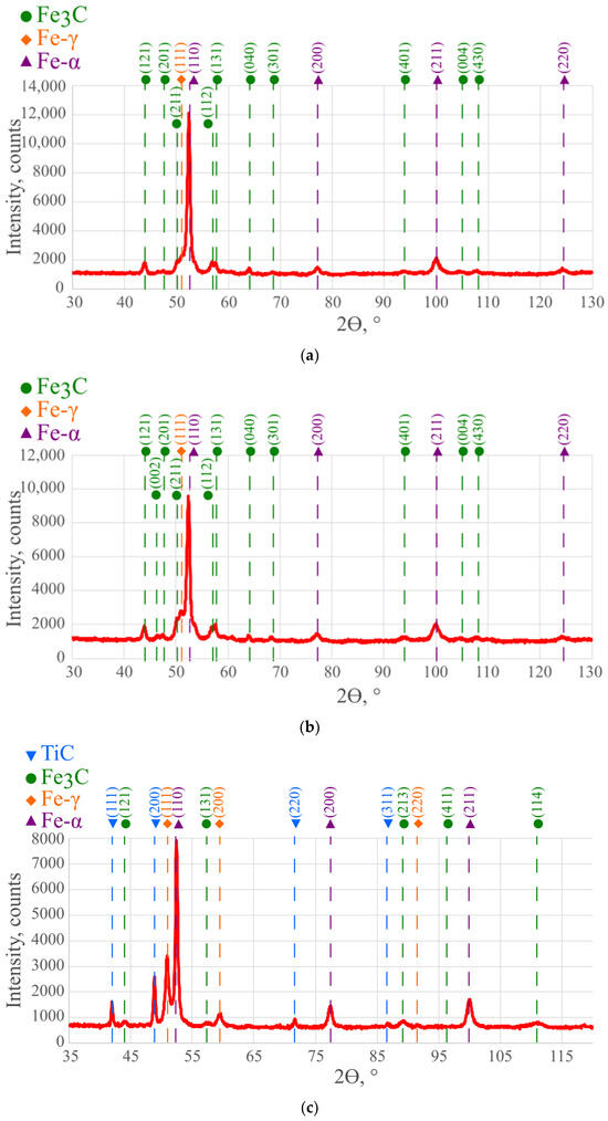 The macroscopic observations were carried out using an Olympus SZX9 optical microscope (Olympus, Tokyo, Japan) manufacturer, city, state (only for USA and Canada), country). Microstructural characterization was performed using a Phenom-World PRO scanning electron microscope (SEM, Thermo Fisher Scientific, Waltham, MA, USA) and FEI TITAN 80/300 transmission electron microscope (TEM, Scientific and Technical Instruments, Hillsboro, OR, USA) with energy dispersive spectroscopy analysis (EDS). The thin foil for TEM investigations was prepared using Xe-PFIB technology. Samples for the macro- and microscopic observations were etched in 4% Nital solution. The phase compositions of the processed surface layers were determined using X-ray diffraction (XRD) analysis with a PANalytical X’Pert PRO MPD diffractometer (Malvern Panalitycal, Malvern, UK) equipped with a PIXcel3D 1 × 1 detector using filtered radiation from a lamp with a cobalt anode. The average TiC(N) precipitate and cementite fractions were measured using the Image-Pro Plus software (version 4.5.0.29) on a total of 8 SEM images of nonetched LSA surface-layer cross-sections (4 near the surface and 4 near the fusion line).