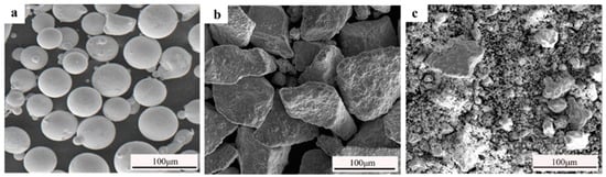In this experiment, the substrate was stainless steel 304 with dimensions of 100 mm × 65 mm × 10 mm. The chemical composition of 304 stainless steel is shown in Table 1. The clad materials used were composed of a mixture of Ni60 with particle sizes of 10–50 μm and nickel-wrapped WC particles sized 20–120 μm. Table 2 lists the chemical composition of the Ni60 powder. ZrW2O8 powder sized 0.5–3 μm and Ni60/WC powder were mixed under different weight fractions using a QM-2SP20-CL (Nanjing University Instrument Factory, Nanjing, China) planetary ball mill (ZrO2 ceramic ball, ball-to-material ratio 4:1, a rotating speed of 120 r/min, and a mixing time of 3 h). Figure 1 shows the scanning electron microscopy (SEM) images of three kinds of cladding powders. It can be seen from Figure 1 that the particles of Ni60 powder are spherical and that the particles of nickel-wrapped WC are large in size with irregular shapes, whereas those of ZrW2O8 powder are small in size with poor fluidity and easy agglomeration.