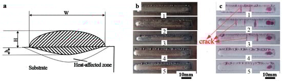 Figure 2a shows a diagram of the typical macroscopic morphology of the coating produced by laser cladding. The forming parameters of the coating mainly include melting height (H), melting width (W), and melting depth (h). Dilution rate (η) refers to the extent to which the substrate metal melts into the coating in the laser cladding process, resulting in a change in the material composition of the coating. Its calculation is performed using the following Formula (2):