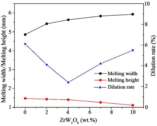 Figure 4 illustrates the trends in melting width, melting height, and dilution rate of cladding coatings with varying ZrW2O8 contents. Due to its low density and small particle size, ZrW2O8 is prone to spattering under the influence of the laser beam and shielding gas. As the ZrW2O8 content increases, spattering becomes more pronounced, dissipating melting energy and resulting in a shallower melt depth of the substrate. When the ZrW2O8 content exceeds 4 wt%, spattering intensifies significantly, reducing the amount of molten powder in the pool. This enhances the dilution effect of the substrate, leading to a decrease in melting height and a subsequent increase in dilution rate. Additionally, the higher the content of ZrW2O8, a negative thermal expansion material, the lower the overall thermal expansion coefficient of the cladding material, thereby weakening the thermal expansion and contraction effect and increasing the melting width of the composite coating.