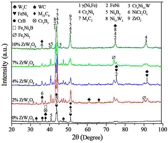 Figure 5 shows the X-ray diffraction patterns of the coatings with different ZrW2O8 contents. The test results indicate that in the absence of ZrW2O8, the phases of the coating consist of γ (Ni,Fe), FeNi3, Cr4Ni15W, Ni4B3, M23C6, CrB, Cr5B3, Fe3Ni2, WC, and W2C, with the presence of W2C indicating WC decomposition. When the ZrW2O8 mass fractions are 2%, 4%, and 7%, the coating phases include γ (Ni,Fe), FeNi3, Cr4Ni15W, Ni4B3, M23C6, FeNi, M3C2, Ni17W3, Cr5B3, NiCr2O4, ZrO2, WC, and W2C. At a ZrW2O8 mass fraction of 10%, the phases are γ (Ni,Fe), FeNi, Ni17W3, Cr4Ni15W, Cr2Ni3, M3C2, Ni4B3, NiCr2O4, ZrO2, WC, and W2C. The XRD patterns reveal that as the ZrW2O8 content in the coating increases, WC is progressively eroded by the liquid metal matrix, leading to greater WC dissolution. This results in the recrystallization of free W and C elements with Cr, Fe, and Ni to form complex carbides, and an increase in W-containing compounds in the coating. Based on studies of the C-Cr-Fe quaternary alloy system [] and experimental results, it is inferred that complex phase transitions may occur in the coating, including: