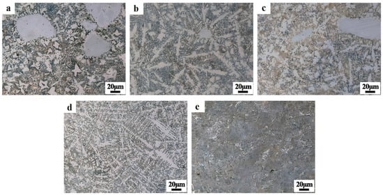 Microstructure and the distribution of WC particles in the coating (a) 0% ZrW2O8; (b) 2% ZrW2O8; (c) 4% ZrW2O8; (d) 7% ZrW2O8; (e) 10% ZrW2O8.