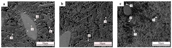 Backscattered electron (BSE) mode SEM microstructures of the coating with varying ZrW2O8 contents: (a) 0% ZrW2O8; (b) 2% ZrW2O8; (c) 10% ZrW2O8.