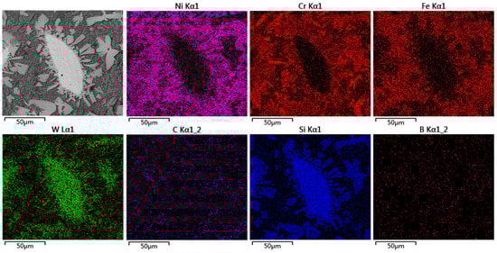 Figure 9 and Figure 10 show the EDS surface scanning results for Ni, Cr, Fe, W, C, Si, and B in samples without ZrW2O8 and with 10% ZrW2O8, respectively. Comparing Figure 9 and Figure 10, it is evident that local segregation occurs in the element distributions of the samples without ZrW2O8, whereas the sample with 10% ZrW2O8 shows a more uniform distribution of elements, particularly W.