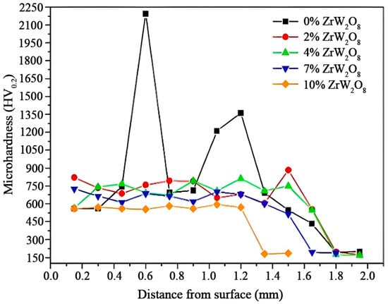 Figure 11 presents the microhardness distribution curves of the cross-sectional coating with varying ZrW2O8 contents. As the amount of ZrW2O8 increases, the average microhardness of the coating gradually decreases, along with the fluctuating range of microhardness. When the addition of ZrW2O8 is 10%, the microhardness fluctuation of the coating is minimal, as is the average microhardness (570 HV0.2). The addition of ZrW2O8 refines the grains of the coating, resulting in a more uniform and finer structure, which enhances the solid solution strengthening effect of W. The hard phase disperses into the dendritic gaps with a fine structure. Moreover, the phase transformation toughening and dispersion toughening of ZrO2, induced by ZrW2O8 in the cladding coating, contribute to an increase in its density. However, the dissolution of WC particles and the formation of dendritic phases with high toughness and low hardness reduce the supporting effect of WC and the hard phases within the coating, leading to a decrease and stabilization in microhardness.