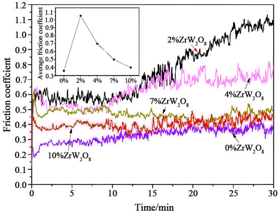Figure 12 displays the wear curves of various samples under identical conditions. Initially, the wear coefficients of most samples are unstable but stabilize over time. The minimum wear coefficient values are observed in the coating without ZrW2O8. As the ZrW2O8 content increases, the amplitude of the wear curves initially rises and then decreases. When the other samples reach the stable wear stage, the wear coefficient of the sample with 2% ZrW2O8 remains in the rising stage and is higher. Conversely, the entire wear process of the coatings with 7% and 10% ZrW2O8 is steady.