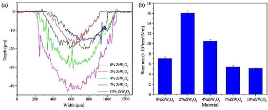 Figure 13 illustrates the two-dimensional morphology of wear tracks and the volume wear rate of coatings after wear at various ZrW2O8 contents. It is observed that as the ZrW2O8 content in the coatings increases, both the maximum depth and maximum width of the wear tracks initially increase before decreasing. Simultaneously, the volume wear rate of the coatings also exhibits a trend of an initial increase followed by a decrease. At a ZrW2O8 content of 10%, the wear rate is minimized, indicating the highest wear resistance.