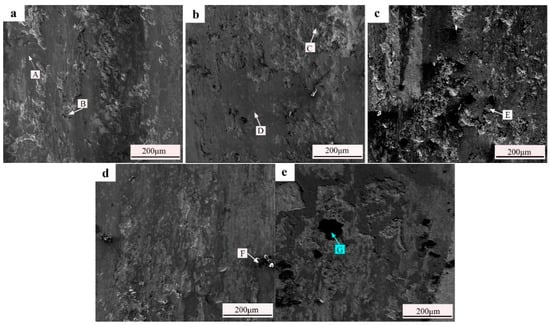 Figure 14 and Table 5 present SEM images and EDS analysis of the worn surfaces on the coatings. The coating without ZrW2O8 exhibits a few thin furrows and shallow adhesion pits. The combination of wear scar morphology and energy spectrum analysis reveals that the primary wear types are adhesive and oxidation wear. Figure 14b,c show adhesive pits and peeling layers caused by crack propagation and tearing. Analysis of point D indicates significant adhesive and fatigue wear, with slight oxidation wear, in the coatings with 2% and 4% ZrW2O8. Consequently, these coatings have higher wear rates, as shown in Figure 13b. When the ZrW2O8 content is between 7% and 10%, the main components of the spalling layers shift from γ (Ni,Fe) to boride and carbide, indicating strengthened γ (Ni,Fe) as the primary matrix. The worn surface of the coating with 7% ZrW2O8 is smooth, with minimal adhesive pits and peeling layers. In contrast, the coating with 10% ZrW2O8 shows only a few adhesive pits and no overall exfoliation.