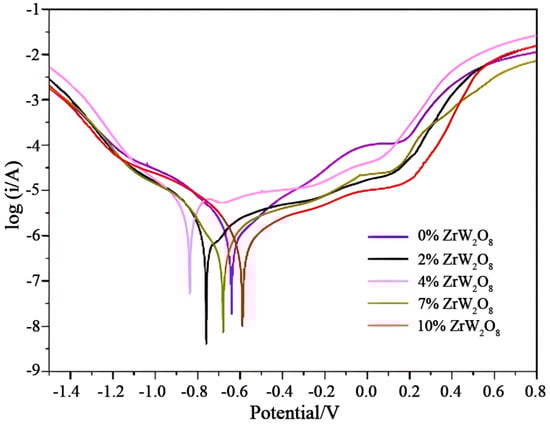 Figure 15 shows the potentiodynamic polarization curves of the coatings in a 3.5 wt% NaCl solution at room temperature. Table 6 lists the corrosion potential (Ecorr), corrosion current density (Icorr), and polarization resistance (Rp) of the investigated coatings. Lower Icorr, higher Ecorr, and higher Rp indicate better corrosion resistance. As seen in Figure 15 and Table 6, the earlier onset of the passivation zone, increased corrosion potential and polarization resistance, and decreased corrosion current density demonstrate that the add ition of ZrW2O8 significantly enhances the corrosion resistance of the Ni-based coating. Notably, the coating with 10% ZrW2O8 exhibits the highest corrosion resistance, while the coating with 4% ZrW2O8 shows the lowest.