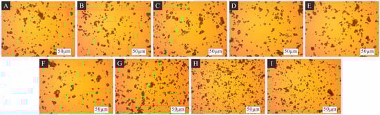 In the microscopic diagrams of the microcapsules from the orthogonal tests shown in Figure 1, A–I corresponds to microcapsule samples 1#–9#. The nine groups of microcapsule samples were successfully prepared, and there were differences in their morphology. According to the principle of light diffraction, due to the different absorption and reflection effects of light by the core and wall materials, an obvious microcapsule shell–core structure can be seen, with the inner white layer as the core material and the ring-shaped dark material as the wall material. Among them, 1#, 3#, 5#, and 7# microcapsules had a small amount of agglomeration, while 2#, 4#, 6#, 8#, and 9# microcapsules were more dispersed and homogeneous with less agglomeration. The morphology was similar to a round shape and had a clear shell–core structure.