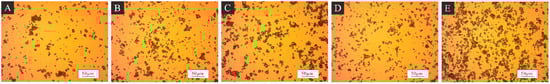 Microscopic images of microcapsules under the single-factor test: (A) 10#, (B) 11#, (C) 12#, (D) 13#, and (E) 14#.