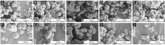 SEM images of microcapsules prepared with different ratios of core to wall: (A) 10# under 3000×, (B) 11# under 3000×, (C) 12# under 3000×, (D) 13# under 3000×, (E) 14# under 3000×, (F) 10# under 5000×, (G) 11# under 5000×, (H) 12# under 5000×, (I) 13# under 5000×, and (J) 14# under 5000×.