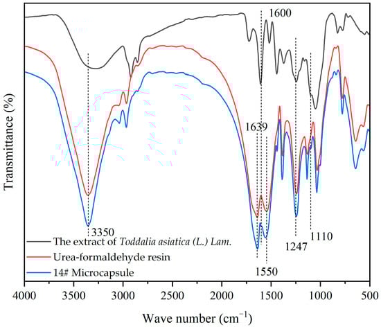 The infrared spectra of the core, wall, and microcapsules is shown in Figure 4. The chemical constituents in the Toddalia asiatica (L.) Lam. are mainly coumarin-like compounds and alkaloids. The absorption peaks appearing at 3350 cm−1 were the C-O of the core material as well as the telescopic vibration peaks of -NH and -OH of the wall material [41]. The 1639 cm−1 and 1550 cm−1 were the characteristic peaks of C=O and C=N in the urea–formaldehyde resin, respectively. The absorption peak at 1247 cm−1 was the characteristic peak of C=O and C=N in the urea–formaldehyde resin. The absorption peaks were caused by the stretching vibration of C-N and N-H in the urea–formaldehyde resin, indicating the presence of urea–formaldehyde resin chemistry in the microcapsules [42]. The characteristic peaks of C=N and C-O in coumarin analogs in the core material were at 1600 cm−1 and 1110 cm−1 [43], which exist in the absorption curves of the microcapsules, but the absorption peaks were weak, proving the presence of core material Toddalia asiatica (L.) Lam. extracts in microcapsules. This was due to the lower content of the core material and lower coverage rate, thus the characteristic peaks of the core extract were weaker. The above indicates that the microcapsules contain the characteristic peaks of core material and wall material, which proves that the microcapsules had been successfully encapsulated.