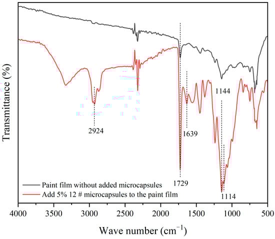 Figure 6 shows the infrared spectra of the waterborne topcoat paint film with added microcapsules and a pure paint film. The absorption peak at 1729 cm−1 shown in the figure is the absorption peak of C=O in the waterborne topcoat paint film [44]. The 1639 cm−1, 2924 cm−1, and 1144 cm−1 peaks were the telescopic vibration peaks of C=O, -CH3, and C-O-C, respectively, in the urea–formaldehyde resin of the microcapsule wall material. The absorption peak of C-O in the core material of the microcapsule was 1114 cm−1 [45]. It was proven that after the microcapsules were added to the waterborne topcoat paint film, the microcapsule wall and core components still existed without chemical reaction.