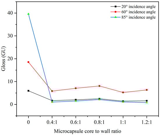 The waterborne topcoat paint film had glossy optical characteristics on the surface of the paint film, which was expressed in terms of the specular reflection ability of the surface of the waterborne topcoat paint film to light [46]. The effect of Wcore:Wwall on the gloss of the waterborne topcoat paint film is shown in Table 12. From the surface gloss measured at three incidence angles of 20°, 60°, and 85°, as shown in Figure 7, it can be seen that the addition of microcapsules will greatly reduce the gloss itself. Under the same addition content of 5.0%, with the increasing Wcore:Wwall of the microcapsules, the gloss showed an overall trend of improving and then declining. When the Wcore:Wwall of the microcapsules was 0.8:1, the gloss of the waterborne topcoat paint film reached maximum values at three incidence angles of 2.47 GU, 8.07 GU, and 2.10 GU, respectively. This is because the unevenness of the waterborne topcoat paint film with microcapsules increases the surface microscopic roughness, increasing the scattering of light and thereby reducing the gloss of the film.