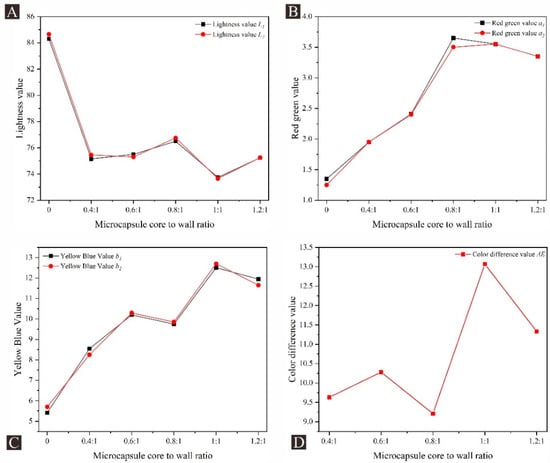 According to GB/T 11186.3-1989 [36], the color difference of the waterborne topcoat paint film was measured and recorded using a SEGT-J colorimeter and the color difference was calculated. The L value is the brightness difference of the waterborne topcoat paint film. The a value is the red–green difference of the waterborne topcoat paint film. The b value is the yellow–blue difference of the waterborne topcoat paint film. Three places on the pure paint film were measured to obtain the average values of L1, a1, and b1. Then, three places on the paint film were measured to obtain another set of data: L2, a2, and b2. The pure paint film was used as a reference sample, and the ΔE of the waterborne topcoat paint film with microcapsules was calculated using the color difference Formula (3).