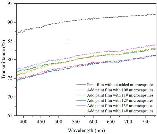 Figure 9 shows the effect of the microcapsules on the light transmittance of the waterborne topcoat paint film [47]. The light transmittance without microcapsules was much higher than that of the waterborne topcoat paint film with microcapsules. The waterborne topcoat paint film with microcapsules was less flat and rougher, which makes the incident light neither transmit nor reflect; instead, it dissipates in the form of scattering, decreasing the transmittance of the waterborne topcoat paint film. The increased core–wall ratio showed a descending trend in terms of the light transmittance of the waterborne topcoat paint film with microcapsules. This is because that with the increasing Wcore:Wwall, the microcapsule agglomeration phenomenon continues to increase, resulting in the unevenness of the waterborne topcoat paint film surface, which reduces the transmission and reflection of the incident light and reduces light transmittance.