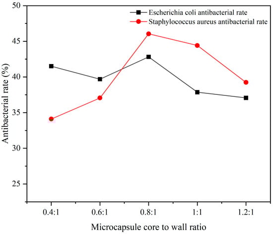 Table 16 shows the antibacterial rate of the waterborne topcoat paint film with different Wcore:Wwall ratios on the surface of glass substrates. Compared with the pure paint film without added microcapsules, the average number of viable bacteria recovered from the surface of the waterborne topcoat paint film with added microcapsules was significantly reduced, proving that the prepared waterborne topcoat paint film had an inhibitory effect on the growth of both bacteria. Figure 10 shows the trends of the antibacterial rate of the waterborne topcoat paint film with added microcapsules against Escherichia coli and Staphylococcus aureus. It can be seen that the antibacterial rate of the waterborne topcoat paint film with Wcore:Wwall increases, and the antibacterial rate of the waterborne topcoat paint film against Escherichia coli first decreased, then increased and then decreased. With a Wcore:Wwall ratio of 0.8:1, the antibacterial rate of Escherichia coli reached a maximum value of 42.82%, with a minimum value of 37.07%, and the Wcore:Wwall at this time was 1.2:1. This is because when the Wcore:Wwall ratio was 1.2:1, the microcapsule agglomerates are significantly unevenly dispersed in the waterborne topcoat paint film, thus reducing the slow-release effect of the core antibacterial agent. The antibacterial rate of the waterborne topcoat paint film against Staphylococcus aureus showed a tendency to increase and then decrease with an increasing Wcore:Wwall ratio. A maximum value was obtained 46.05% when the Wcore:Wwall ratio was 0.8:1. The minimum value of 34.10% when the Wcore:Wwall was 0.4:1. This is due to the fact that the microcapsule core with a Wcore:Wwall ratio of 0.4:1 has less content, and less antibacterial agent can be slow-released; therefore, the antibacterial rate of the waterborne topcoat paint film is lower. As can be seen in Figure 10, on the whole, the antibacterial rate of the waterborne topcoat paint film against Staphylococcus aureus was higher than that against Escherichia coli. This is due to the effective antibacterial component, coumarin analogs, in the Toddalia asiatica (L.) Lam. extracts of the core material, which has a higher antibacterial effect on Staphylococcus aureus than on Escherichia coli [50,51]. Therefore, the prepared antibacterial varnish achieved the maximum antibacterial rate against both Escherichia coli and Staphylococcus aureus when the Wcore:Wwall ratio was 0.8:1 (Sample 12#). The volatility of the standard deviations of the antimicrobial rates of the two bacteria was low, and the data were informative.