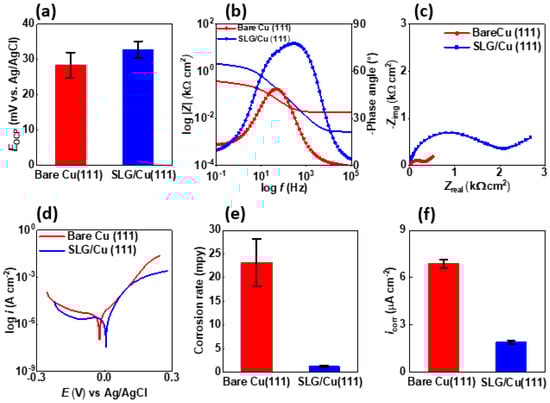 The SLG/Cu (111) displayed a more positive open-circuit potential (Eocp) (32.8 ± 2.4 mV vs. Ag/AgCl/1 M KCl) compared to bare Cu (111) (28.42 ± 3.6 mV vs. Ag/AgCl/1 M KCl) (Figure 2a) under identical abiotic conditions (0.5 M H2SO4). This nobler Eocp (more positive) suggests reduced chemical reactivity, a diminished thermodynamic driving force for oxidation, and enhanced corrosion resistance of SLG/Cu (111). The absolute impedance for SLG/Cu (111) (2 kΩ cm2) was five times greater than that for bare Cu (111) (0.3 kΩ cm2), based on the y-intercept values in the lower-frequency domains of the Bode plots (Figure 2b). The phase angle maxima for SLG/Cu (111) (77.65°) was also greater than that of bare Cu (111) (48.51°) at the low-frequency region. Even in the high-frequency region, the phase angle values for SLG/Cu (111) (4.02°) were greater than those of bare Cu (111) (−0.7132°), which further affirms heightened resistance to corrosion [59,60,61,62,63]. The EEC fitting (Figure S4) of the Nyquist plot (Figure 2c) for SLG/Cu (111) showed a 2-fold higher pore resistance (Rpo) and 1.7-fold higher charge transfer resistance (Rct) compared to bare Cu (111) (Table S1). The results from Tafel analysis demonstrate the utility of this technique in assessing the corrosion resistance of as-grown SLG films. The Tafel analysis revealed a nobler corrosion potential (Ecorr) (7.22 mV) than bare Cu (111) (-21.8 mV) (Table S2). The SLG/Cu (111) also experienced a lower anodic current in the anodic branch compared with its counterpart (Figure 2d). Finally, the corrosion rates for SLG/Cu (111) (1.2 ± 0.2 mpy) were 19-fold less than those of bare Cu (111) (23.1 ± 5 mpy) (Figure 2e), based on the Tafel analysis. The lower corrosion rates aligned well with a 3.6-fold lower corrosion current density (icorr) for SLG/Cu (111) (1.9 µA cm−2) compared to bare Cu (111) (6.9 µA cm−2) (Figure 2f). Overall, these outcomes demonstrate the promise of leveraging SLG films grown on copper single crystals as high-performance coatings.