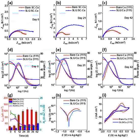 Electrochemical corrosion test analysis of SLG/Cu (111) established corrosion resistance of graphene coating in sulfate-reducing bacterial (Oleidesulfovibrio alaskensis G20) environment: Nyquist plot exhibiting impedance to corrosion for both bare and SLG-coated Cu (111) samples on (a) day 0, (b) day 21, and (c) day 42. Bode plots for both samples on (d) day 0, (e) day 21, and (f) day 42 showing consistently higher absolute impedance at low frequency for SLG/Cu (111) implying higher corrosion resistance compared to bare Cu (111) throughout the test duration (g) corrosion current density, icorr, and polarization resistance, Rp of both, were monitored from day 0 to 42. (h) Tafel plot exhibited higher corrosion resistance for SLG/Cu (111) sample, and (i) cyclic voltammetry was conducted to further investigate the electrochemical properties of the samples.