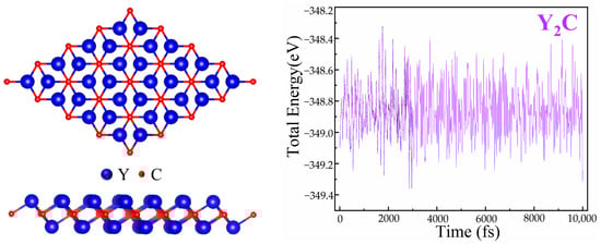 The Y2C monolayer with space group R-3m has a two-dimensional crystal structure made up of two Y layers sandwiched between a C layer. Each surface Y atom is coordinated to three C atoms, while each C atom is covalently bound to six Y atoms. The Y-C bond length is 2.482 Å, and the optimized Y2C monolayer lattice parameter is a = b = 3.62 Å. This result is consistent with the literature [39,40,41,42]. Long-term operation of the two-dimensional structural framework requires stability. Consequently, by using ab initio arithmetic molecular dynamics (AIMD) simulations with the Nose–Hoover thermal bath technique, the thermal stability of the Y2C monolayer structure was assessed. After 10 ps simulation, the Y2C monolayer structure remained intact at 300 K. Figure 1 shows the final structure and energy distribution during the AIMD simulation, and the Y2C monolayer structure did not undergo deformation, indicating its good thermal stability at room temperature.