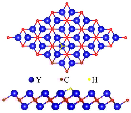 The catalytic activity of HER is frequently characterized by the Gibbs free energy of hydrogen adsorption (ΔGH*). To guarantee the highest catalytic activity, the value of ΔGH* on the catalyst should be very near zero. The adsorption behavior of hydrogen atoms on the surface of the Y2C monolayer was first computed to identify the most advantageous adsorption sites in order to investigate the HER catalytic activity of Y2C. On top of three Y atoms on the surface lies the best active site for H adsorption, as shown in Figure 2. There are three basic reactions for HER, which are the Vollmer reaction, the Tafel reaction, and the Helovsky reaction. The Volmer reaction, or electrochemical adsorption (H+ + e− → H*), is the initial stage. Hydrogen atoms are adsorbed onto the catalyst’s active sites during this process. In the subsequent phase, known as desorption, the adsorbed H* atoms undergo reduction to generate H2 molecules through either the Tafel reaction (H+ + e− + H* → H2) or the Heyrovsky reaction (H* + H* → H2). However, the values of Y2C adsorption and desorption processes are close to 1 eV, which suggests that hydrogen atoms are difficult to desorb from the catalyst surface. Our DFT calculations confirm the low HER catalytic activity of the pristine Y2C monolayer, which is reflected by the corresponding ΔGH* value (−0.673 eV).