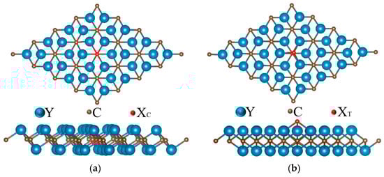 Top view and side view of (a) XC @Y2C and (b) XT @Y2C after doping.