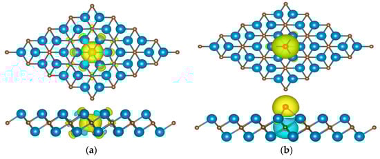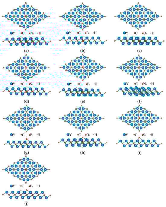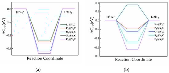 Therefore, to further tune the ΔGH* value to zero, we explored the doping of Y2C monolayers with simple atoms N, P, O, S, and F. The doping of Y2C monolayers with simple atoms N, P, O, S, and F was also explored. In two-dimensional transition metal carbides, the true active site is generally dominated by cations, and the surrounding anionic environment generally modulates the cations and enhances activity. Due to the strong or weak binding to the reaction intermediates, the doped metal elements lead to the complexity of the active metal sites; therefore, we influenced the electronic structure of the metal ions by substituting the original anions of the compounds with non-metal atoms (X = N, P, O, S, and F) and influence the interactions of the active sites with the reactants, intermediary adsorption, and the final products during the reaction process, which modulates the intrinsic activity, to further improve catalytic performance. For the doping of non-metallic atom X, two doping configurations were considered: (a) one non-metal X atom replacing one C atom, XC, and (b) non-metal X adsorbing on the top of the hollow site of three Y center, XT, as shown in Figure 3.