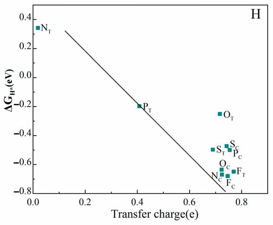 Table 3 and Figure 5 show the ΔGH* of N, P, O, S, and F doping on the monolayer Y2C surface. On the fully mono-doped surface, the catalytic hydrogenolysis ability of monolayer Y2C doped with non-metallic NC, OC, FC, and FT is comparable to that of the pristine Y2C monolayer, which is unsuitable for HER. The ΔGH* values of PC, SC, NT, OT and ST doped on the monolayer Y2C surface are in the range of −0.25~−0.5 eV, and compared to pure transition metallizers (Table 4), the introduction of surface heteroatom (non-metallic atom) dopants in MXenes can activate their surfaces and further increase the number of active sites, thus improving catalytic activity, which are significantly lower in number compared to those of pristine Y2C, indicating an increase in its HER activity. Notably, compared to the Gibbs free energy of H adsorption (ΔGH*) of the above five doped configurations, only PT doped on the monolayer Y2C surface has |ΔGH*| less than 0.2 eV, indicating the highest catalytic activity. This is consistent with the results analyzed later that P atoms have the least electronegativity and that doping increases the charge density of the space charge layer in this region, increasing the catalytic activity of its surface. In addition, charge transfer is another indicator used to characterize the adsorption strength of the Y2C substrate with H atoms. The less charge transfer, the weaker the interaction between the substrate and H atoms. As shown in Figure 6, the Bader charge analysis reveals that the ΔGH* of non-metal substitution and adsorption doping in monolayer Y2C is negatively and linearly correlated with the transferred charge.