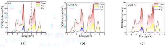 The formation energies (Ef) of XC@Y2C and XT@Y2C doping can be used to estimate the likelihood of a doping reaction occurring based on the Ef values: a negative value indicates that the doping reaction proceeds spontaneously, and a positive value indicates that additional energy is required to overcome the energy barrier when dopant atoms are introduced into the host structure, which is calculated as shown in Table 1. For non-metallic substitutional doping, the formation energies of NC, OC, SC, and FC are all negative, except for PC, which has a positive formation energy of 1.215 eV, indicating that the formation process of NC, OC, SC, and FC is exothermic and the formation reaction of PC is heat-absorbing. Interestingly, the formation energies of all XT are negative, indicating that non-metallic elements are readily adsorbed on Y2C. In addition, the formation energy of the F atom is the largest, confirming the strong adsorption of non-metallic elements on Y2C.