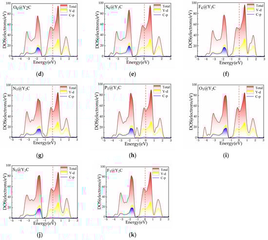 The total and projected density of states (PDOS): (a) Y2C, (b) NC@Y2C, (c) PC@Y2C, (d) OC@Y2C, (e) SC@Y2C, (f) FC@Y2C, (g) NT@Y2C, (h) PT@Y2C, (i) OT@Y2C, (j) ST@Y2C, and (k) FT@Y2C.