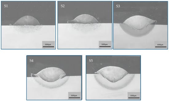 The cross-sectional morphology of the A-100 ultra-high-strength steel cladding coatings is exhibited in Figure 3. The cladding coatings presented an upward arch. The bonding between the cladding coating and the substrate was good, and there was no cracking phenomenon between the cladding coating and the substrate. With an increase in the laser’s specific energy (S1→S5), the penetration depth and dilution rate of the cladding coatings increased. There were no pores or microscopic cracks inside the cladding coatings.
