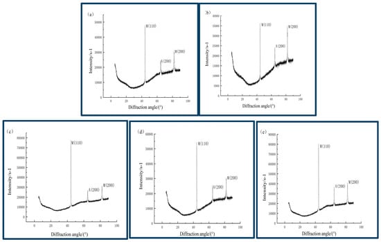 XRD phase analysis results of A-100 ultra-high-strength steel cladding coatings: (a) S1, (b) S2, (c) S3, (d) S4, (e) S5.