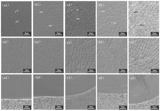 Microstructure of A-100 ultra-high-strength steel cladding coatings: (a1) upper of S1, (a2) middle of S1, (a3) bottom of S1, (b1) upper of S2, (b2) middle of S2, (b3) bottom of S2, (c1) upper of S3, (c2) middle of S3, (c3) bottom of S3, (d1) upper of S4, (d2) middle of S4, (d3) bottom of S4, (e1) upper of S5, (e2) middle of S5, (e3) bottom of S5.