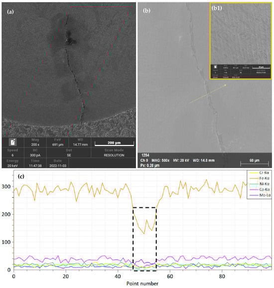 It can be seen from Figure 5 that when the laser specific energy was 166.7 J/mm2 (S5 cladding coating), a crack appeared at the fusion line between the lower part of the cladding coating and the substrate. In order to further study the causes of the crack, overall and local high-magnification images of the crack and an element line scanning analysis of the crack are shown in Figure 6. The element scan analysis path follows the yellow arrow in Figure 6b. It can be seen from Figure 6a that the width of the lower part of the crack was larger than that of the upper part. Therefore, the crack originated from the fusion line and expanded to the upper part of the sample. Therefore, the crack was considered to be a cold crack. High laser specific energies can make the grain size of the lower part of the S5 cladding sample coarse (as shown in Figure 6(b1)). During the solidification process, the cladding coating is subjected to tensile stress from the substrate material. High laser specific energies can increase the heat-affected zone and hardenability of the substrate material, so that the tensile stress of the cladding coating from the substrate material also increases, and the crack resistance of the coarse microstructure is poor. In addition, according to the element line scanning analysis results for the crack (as shown in Figure 6c), the variation tendency of Mo at the crack was increased, while the variation tendency of other elements was decreased; Mo improves the hardenability of steel materials, which also leads to a high hardening embrittlement crack sensitivity at the cracking site.
