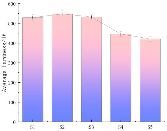 In order to visually observe the changing trend of the microhardness of the coatings, the average value of the microhardness of the coatings is shown in Figure 7. It can be seen from Figure 7 that the microhardness of the cladding coatings generally decreased with increasing laser specific energy. With an increase in laser specific energy, the microhardness of the cladding coatings decreased because an increased amount of iron diffused into the cladding coating. Moreover, a high laser specific energy can make the molten pool exist for a longer time, and the grains can have enough time to grow. Excessive grain growth makes the microstructure of the cladding coating become coarse. According to the Hall–Petch relation, coarse grains reduce the strength and microhardness of cladding coatings [23].