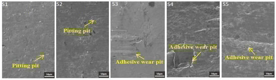 The wear morphologies of the A-100 ultra-high-strength steel cladding coatings are demonstrated in Figure 8. The wear morphology pictures for the S4 cladding coating were derived from our previous research results [5]. This is because the S4 cladding coating was the same as that in ref. [5]. When the laser specific energy was low (S1 and S2 cladding coatings), the wear surfaces of the cladding coatings were relatively smooth, and small pitting pits were generated on their surfaces due to friction. When the laser specific energy was increased to 83.3 J/mm2, adhesive wear pits appeared on the wear surface of the cladding coating. With a further increase in the laser specific energy, the adhesive wear pits on the wear surfaces of the cladding coatings were more obvious, and the size of the adhesive wear pits became larger. At this time, the wear surfaces of the cladding coatings became rough and presented typical adhesive wear characteristics. Friction and wear on the cladding coating result from the process of friction between the friction pair and the coating under the action of downward pressure. During the friction process, the temperature of the cladding coating increases due to friction heat generation. If the microhardness of the cladding coating is low, the surface material of the cladding coating easily softens and deforms, resulting in cold welding between the friction pair. Under the action of the relative motion between the cladding coating and the friction pair, the surface material of the cladding coating is torn off by the friction pair, thus forming an adhesive wear pit. The lower the microhardness of the cladding coating, the easier it is for cold welding to form between the cladding coating and the friction pair, and the easier it is for adhesive wear pits to form under the action of the relative motion of the cladding coating and the friction pair. If the microhardness of the cladding coating is higher, the surface material of the cladding coating is less likely to soften and deform, that is, it is less likely to form adhesive wear pits.