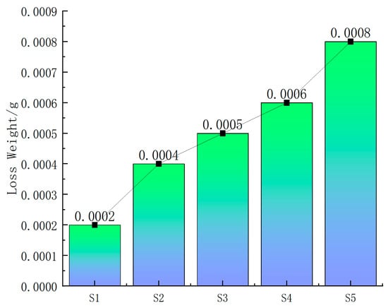 Figure 9 shows the wear loss weights of the A-100 ultra-high-strength steel cladding coatings. It can be intuitively observed from the figure that with an increase in the laser specific energy, the wear loss weight of the A-100 ultra-high-strength steel cladding coatings increased and the wear resistance decreased. The surface adhesion wear of the cladding coatings was much more serious than that caused by pitting.