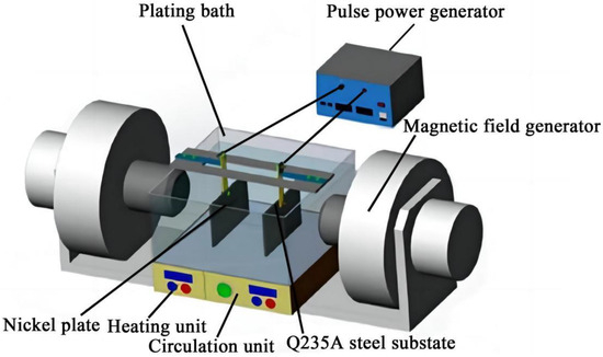 The use of magnetic fields in the coating process is an effective way to transfer kinetic and thermal energy. The presence of an external magnetic field during the ED process alters the electrochemical system by affecting magnetization, magneto-mechanical, and magnetohydrodynamic (MHD) effects. The MHD effect, in particular, enhances the mass transport and distribution of nanoparticles within the plating solution by generating micro-turbulence and convection currents. This leads to more uniform dispersion of nanoparticles, which is crucial for achieving consistent coating quality [7]. Azizi-Nour et al. prepared Ni-Al2O3 nanocomposite coating by co-electrodeposition of magnetic sediments and investigated the MHD process of the coating by the co-deposition kinetic model [8]. Long et al. introduced the latest development of electrodeposition technology assisted by the magnetic field, pointed out that Lorentz force is the main factor of the magnetization effect, and summarized the research status of various coatings [9].