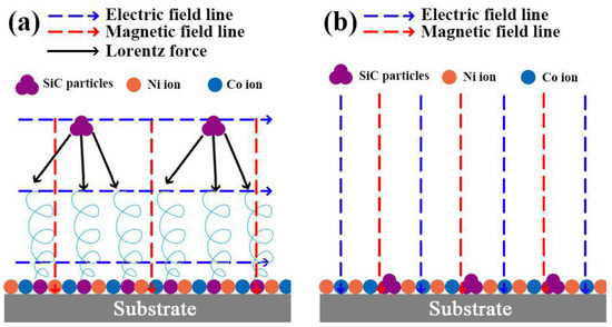 The following mechanisms account for these observations. (1) When the magnetic field is oriented at right angles to the applied electric field, it induces a Lorentz force (refer to Figure 3a), thereby causing the MHD effect. This effect, as previously reported in the research by Waware et al., decreases the gravitational sedimentation and agglomeration of SiC particles within the electrolyte [17]. As a result, the Ni-Co-SiC coating forms a compact and smooth surface (Figure 2b). On the other hand, in the case where the magnetic field is along the direction as the electric field (see Figure 3b), the agglomerated particles of SiC disperse throughout the substrate surface. (2) The MHD effect facilitates electrolyte mixing that proves advantageous for detaching hydrogen bubbles adhered to the surface of the cathode and reducing concentration polarization. This conclusion corresponds to the findings reported by Rao et al. [18]. (3) Microscale vortex convection occurs when the electric and magnetic fields are parallel to each other, improving the electrolyte’s mass transport [19]. (4) The magnetization effect lowers the energy required for the deposition of ions onto the cathode surface during ED. Thus, the more homogeneous, compact, and flat surface topologies seen for MS1 and MS2 in comparison to MS0 can be attributed to the magnetization and MHD effects.