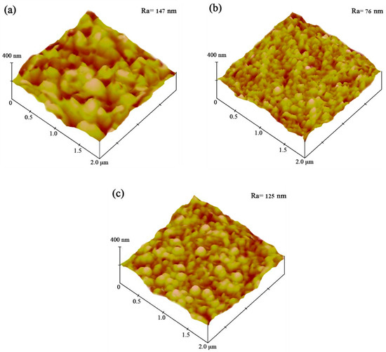 AFM pictures of various Ni-Co-SiC coatings: (a) MS0, (b) MS1, and (c) MS2.