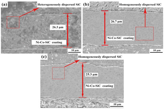 Cross regions of different Ni-Co-SiC coatings: (a) MS0, (b) MS1, and (c) MS2.