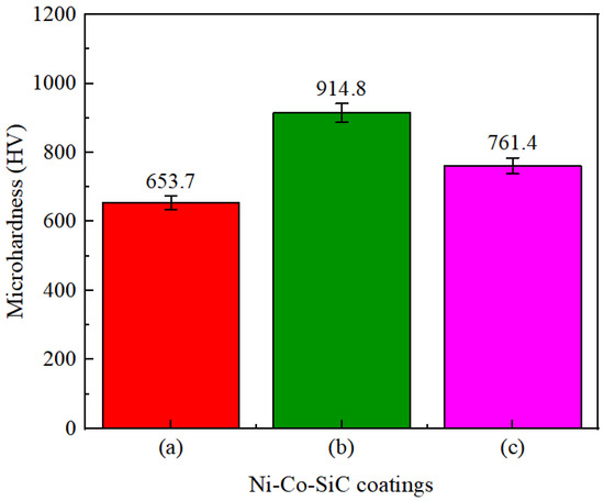 The hardness values of different Ni–Co–SiC coatings are depicted in Figure 8. The MS2, MS1, and MS0 had mean microhardness values (761.4, 914.8, and 653.7 HV), respectively. According to Huang et al. [25], an enhanced microhardness is caused by the homogeneous distribution of ceramic particles. The homogeneous distribution of SiC particles in the coatings enhanced the impact of dispersion hardening and fine crystal strengthening on Ni–SiC coatings [26]. This led to an increase in the mean microhardness values of MS1 and MS2 coatings. Moreover, compared to Ni grains, the SiC particles revealed improved microhardness. Thus, the enhanced SiC content observed in MS1 (Figure 4b) correlates with its improved microhardness.