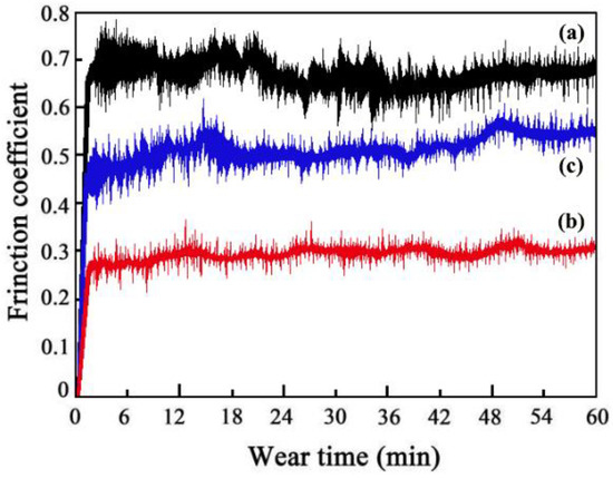 Friction coefficients of Ni-Co-SiC coatings: (a) MS0, (b) MS1, and (c) MS2.