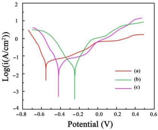 Polarization curves of Ni-Co-SiC coatings in the 3.5 wt.% NaCl solution: (a) MS0, (b) MS1, and (c) MS2.