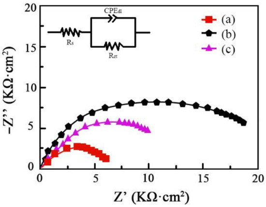 Nyquist plots for corrosion behavior of Ni-Co-SiC coatings: (a) MS0, (b) MS1, and (c) MS2.