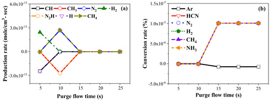 Chemical kinetics simulation results: (a) production rate and (b) conversion rate by purge flow time.