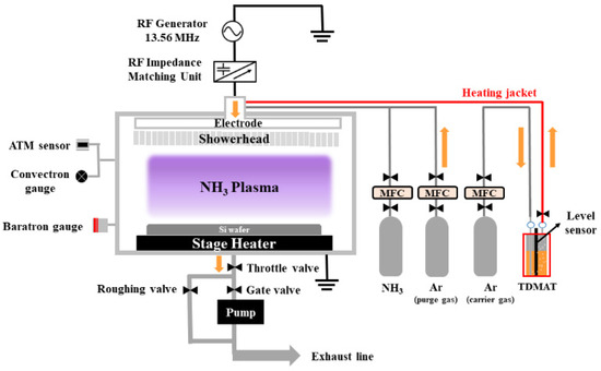 TiN films were deposited in a PEALD system (Plus200, QUROS, Republic of Korea) using 64 cycles of precursor/purge/reactant/purge steps. The PEALD system featured a CCP-type chamber with 13.56 MHz of RF source power, as illustrated in Figure 3. The canister containing TDMAT was maintained at 65 °C by the temperature controller, while the chamber temperature was set to 230 °C. During the plasma-on step, 300 watts of RF power was applied. The thickness of the deposited PEALD-TiN films was measured by a spectroscopic ellipsometer (M-2000, J.A. Woollam, Lincoln, NE, USA). Because ALD thin films grow in thin layers, high-resolution measurements were required. Therefore, we used an ellipsometer that can accurately measure the thickness and refractive index of a film by analyzing changes in the polarization state of light. The non-uniformity was calculated using Equation (3):