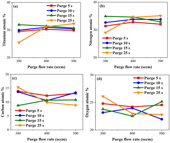 Atomic percentages of (a) titanium, (b) nitrogen, (c) carbon, and (d) oxygen by purge gas flow rate.