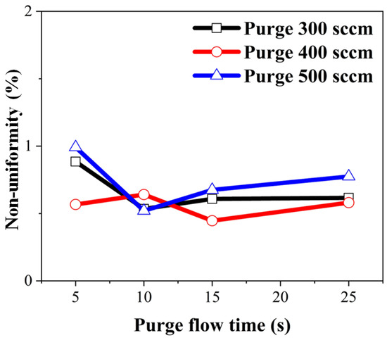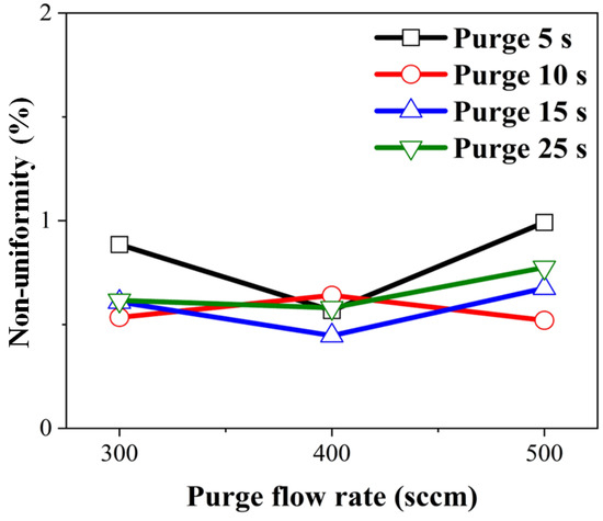 It was anticipated that increasing the purge gas flow time would result in decreased non-uniformity due to the removal of physically adsorbed impurities. Non-uniformity concerning purge gas flow time was calculated by substituting film thickness into Equation (3) and is depicted in Figure 11. Under all conditions, non-uniformity was measured to be within 1%. The highest non-uniformity was observed with a 5 s purge gas flow time and 500 sccm purge gas flow rate, coinciding with elevated carbon and oxygen percentages. Even at a 25 s gas flow and 500 sccm purge gas flow rate, non-uniformity remained high, while carbon and oxygen impurities were low. Hence, it can be concluded that the decrease in non-uniformity with increasing purge gas flow time did not have a significant impact.